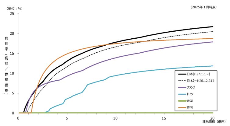 課税価格が高くなるほど、日本と他国との差は大きくなり、課税価格が20億円の場合では二位のイギリスとは5%近く負担率に差が出ます。また、課税価格が1億円未満の場合においても、日本はフランスと並んで比較的高い負担率となっています。